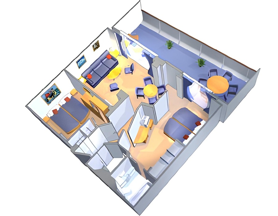 Площадь каюты ≈ 55 м². Площадь балкона ≈ 25 м². Максимальная вместимость: 8 человек.