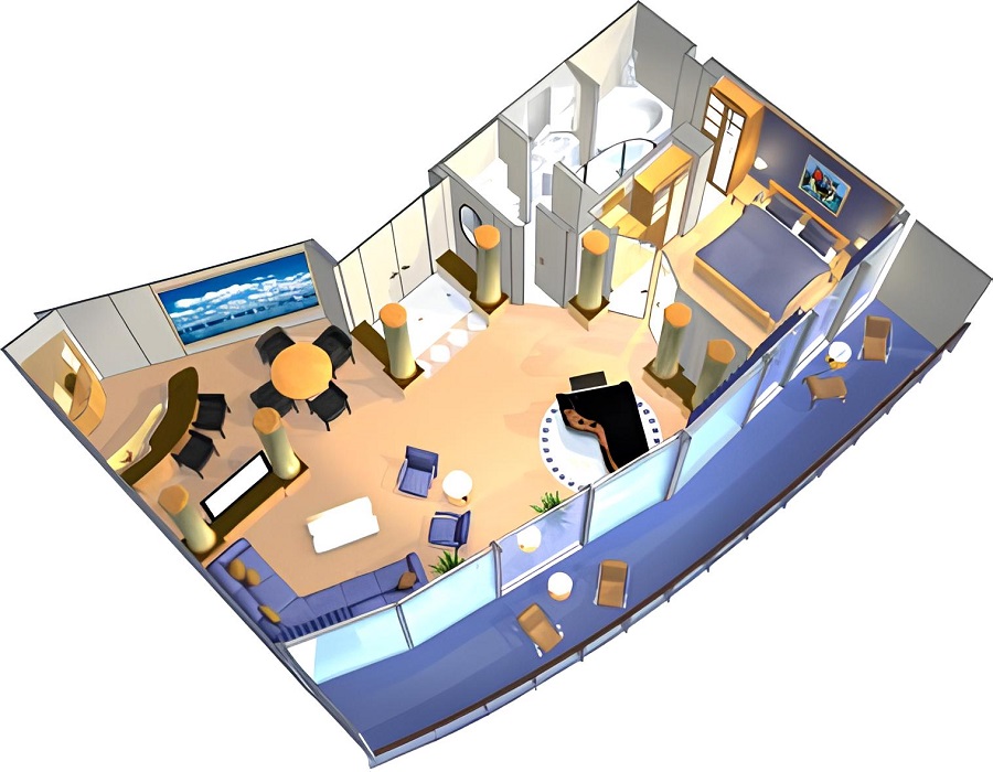 В каюте: две двуспальные кровати, две полки верхнего расположения, две ванные комнаты (раковина, душ, ванна, туалет), банные халаты, тапочки, комплект полотенец, туалетные принадлежности, фен, двуспальный диван, кресло, кофейный столик, интерактивное TV, телефон, радио, сейф, кондиционер, мини-бар (оплачивается дополнительно), выделенная линия для подключения к сети интернет (оплачивается дополнительно), стеклянная балконная дверь-окно, персональный балкон с мебелью для отдыха.
