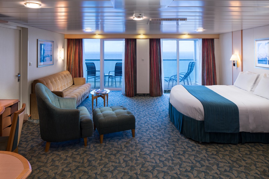 В каюте: одна двуспальная кровать (при необходимости трансформируется в две односпальные кровати), двуспальный диван, ванная комната (раковина, душ, туалет), банные халаты, тапочки, комплект полотенец, туалетные принадлежности, фен, кресло, кофейный столик, интерактивное TV, телефон, сейф, кондиционер, мини-бар (оплачивается дополнительно), выделенная линия для подключения к сети интернет (оплачивается дополнительно), стеклянная балконная дверь-окно, персональный балкон с мебелью для отдыха.