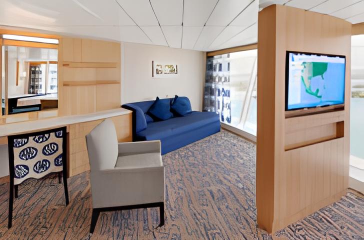 В каюте: две двуспальные кровати, две полки верхнего расположения, две ванные комнаты (раковина, душ, ванна, туалет), банные халаты, тапочки, комплект полотенец, туалетные принадлежности, фен, двуспальный диван, кресло, кофейный столик, интерактивное TV, телефон, сейф, кондиционер, мини-бар (оплачивается дополнительно), выделенная линия для подключения к сети интернет (оплачивается дополнительно), стеклянная балконная дверь-окно, персональный балкон с мебелью для отдыха.