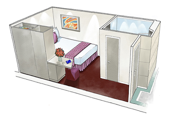 В каюте: одна кровать, ванная комната (раковина, душ, туалет), телефон, фен, мини-бар, сейф, кондиционер, интерактивное TV, беспроводной Интернет (оплачивается дополнительно), виртуальный персональный круизный ассистент ZOE, каюта без окна.