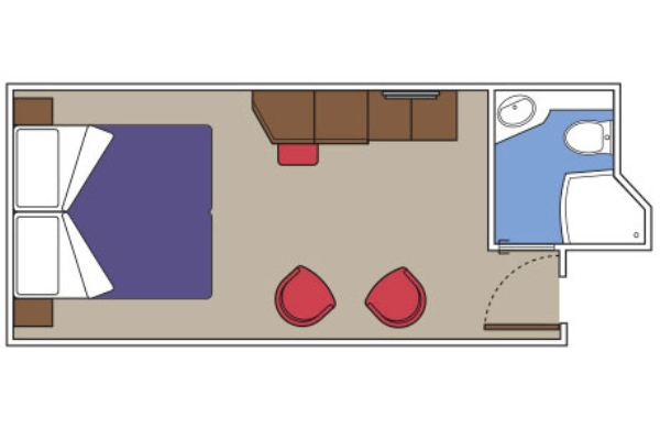 В каюте: одна кровать, ванная комната (раковина, душ, туалет), телефон, фен, мини-бар, сейф, кондиционер, интерактивное TV, беспроводной Интернет (оплачивается дополнительно), виртуальный персональный круизный ассистент ZOE, каюта без окна.