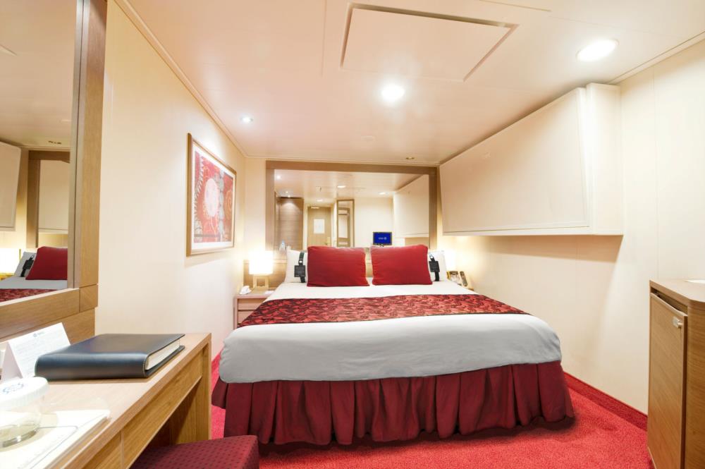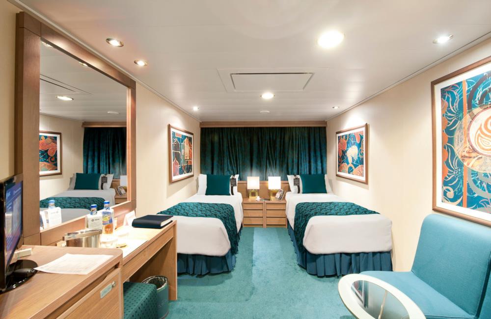 В каюте: две односпальные кровати (при необходимости трансформируются в двуспальную кровать), ванная комната (раковина, душ, туалет), телефон, фен, мини-бар, сейф, кондиционер, интерактивное TV, беспроводной интернет (оплачивается дополнительно), каюта без окна.