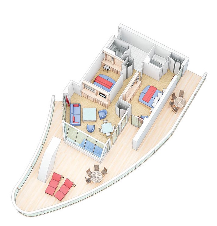 В каюте: одна двуспальная кровать (при необходимости трансформируется в две односпальные кровати), две ванные комнаты (раковина, ванна, туалет), банные халаты, тапочки, комплект полотенец, туалетные принадлежности, фен, две односпальные кровати (при необходимости трансформируются в одну двуспальную), двухъярусная кровать, диван, кресло, кофейный столик, интерактивное TV, телефон, сейф, кондиционер, мини-бар (оплачивается дополнительно), выделенная линия для подключения к сети интернет (оплачивается дополнительно), стеклянная балконная дверь-окно, персональный балкон с мебелью для отдыха.