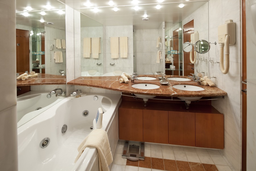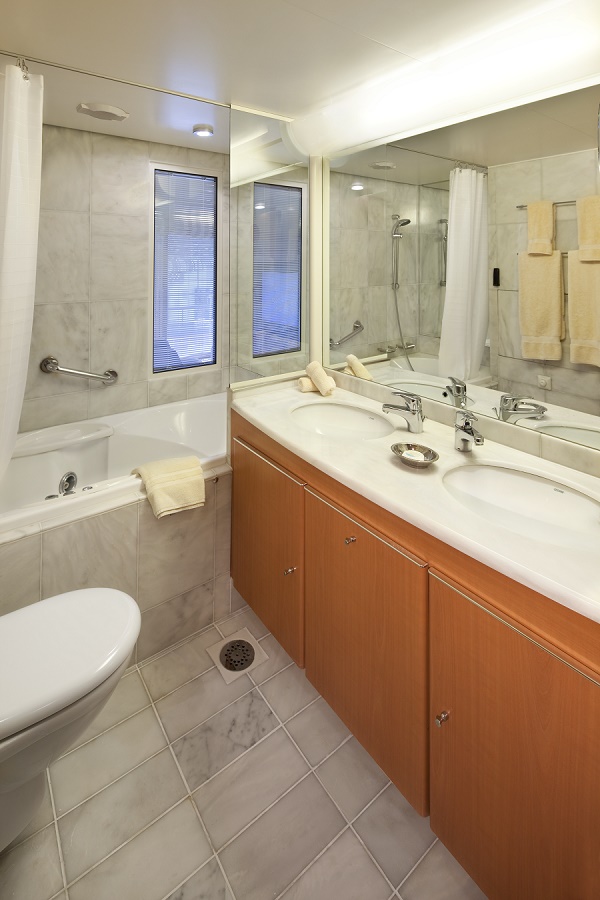 В каюте: две двуспальные кровати, две ванных комнаты (раковина, душ, ванна, туалет), диван, стол, интерактивное ТВ, телефон, сейф, фен, мини-бар (за дополнительную плату), халаты, тапочки, набор туалетных принадлежностей, комплект полотенец, стеклянная балконная дверь-окно, персональный балкон с мебелью для отдыха с джакузи.