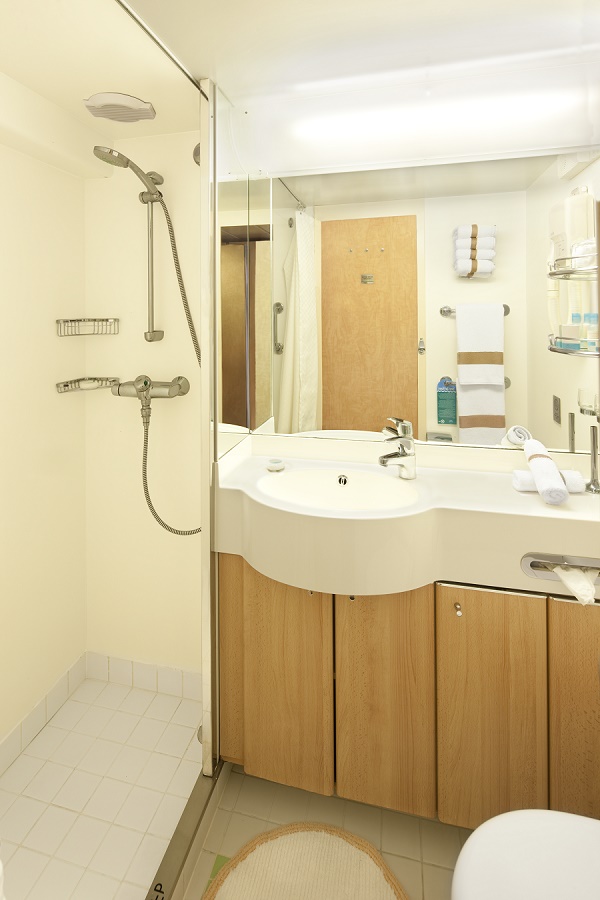 В каюте: одна двуспальная кровать (при необходимости трансформируется в две односпальные кровати), ванная комната (раковина, душ, туалет), зеркало, диван, интерактивное ТВ, сейф, фен, мини-бар (за дополнительную плату), халаты, набор туалетных принадлежностей, комплект полотенец, доставка багажа, без окна.