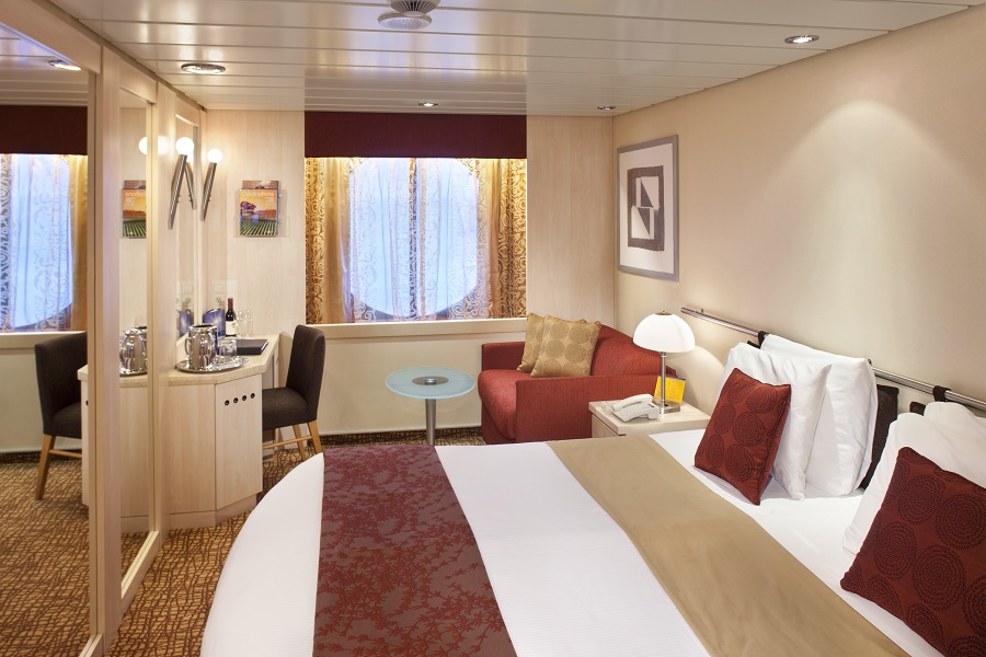 В каюте: одна двуспальная кровать (при необходимости трансформируется в две односпальные кровати), ванная комната (раковина, душ, туалет), кресло, интерактивное ТВ, сейф, фен, мини-бар (за дополнительную плату), халаты, набор туалетных принадлежностей, комплект полотенец, доставка багажа, иллюминатор.