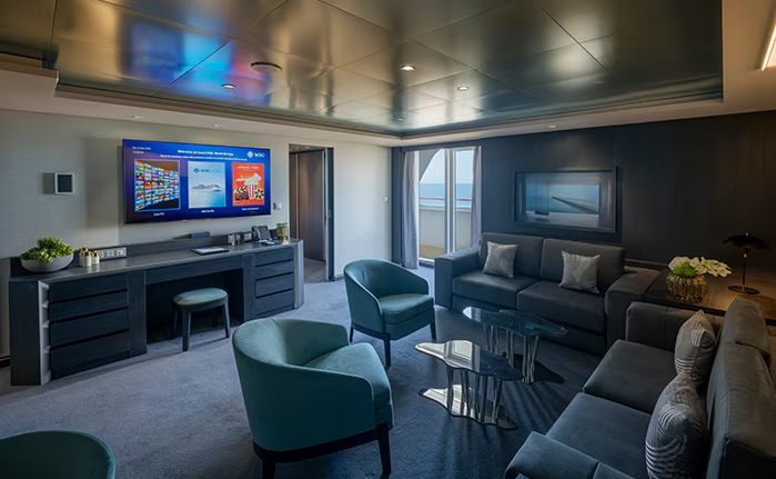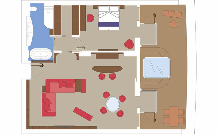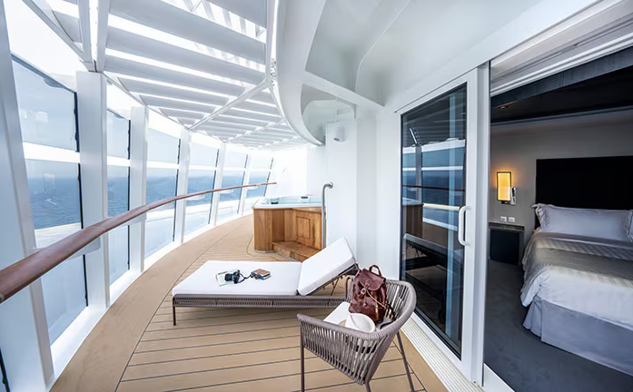 В каюте: две односпальные кровати (при необходимости трансформируются в двуспальную кровать), зона гостиной с диваном, ванная комната (раковина, душ или ванна, туалет), телефон, фен, мини-бар (включен в стоимость), сейф, кондиционер, интерактивное TV, беспроводной интернет (безлимитный интернет-пакет Browse cruise package на 2 устройства), персональный балкон с мебелью для отдыха и джакузи.