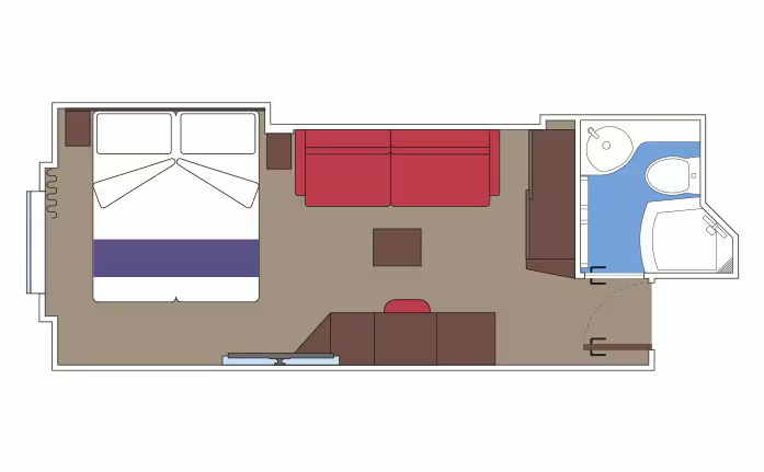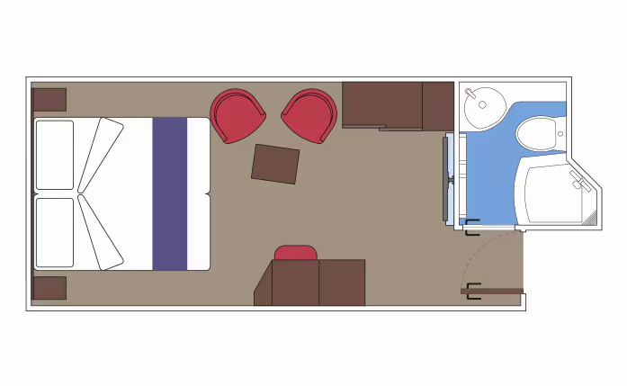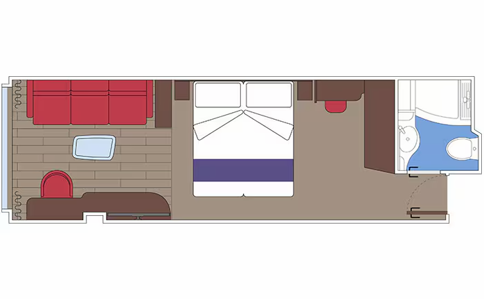 В каюте: две односпальные кровати (при необходимости трансформируются в двуспальную кровать), диван, ванная комната (раковина, душ, туалет), телефон, фен, мини-бар (включен в стоимость), сейф, кондиционер, интерактивное TV, беспроводной интернет (безлимитный интернет-пакет Browse cruise package на 2 устройства), персональный балкон с мебелью для отдыха.