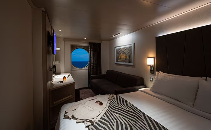 В каюте: две односпальные кровати (при необходимости трансформируются в двуспальную кровать), ванная комната (раковина, душ, туалет), диван, телефон, фен, мини-бар, сейф, кондиционер, интерактивное TV, беспроводной интернет (оплачивается дополнительно), обзорное окно (не открывается).
