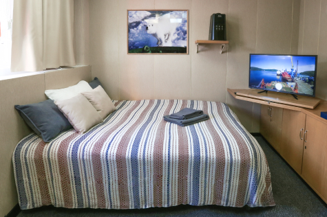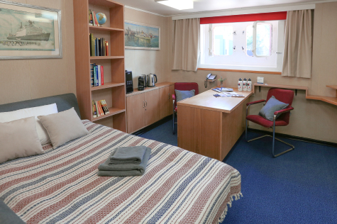 В каюте: двуспальная кровать, диван, ванная комната (раковина, душ, туалет), телевизор, письменный стол, стул, шкаф для одежды, два обзорных окна (открываются).